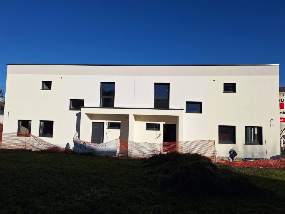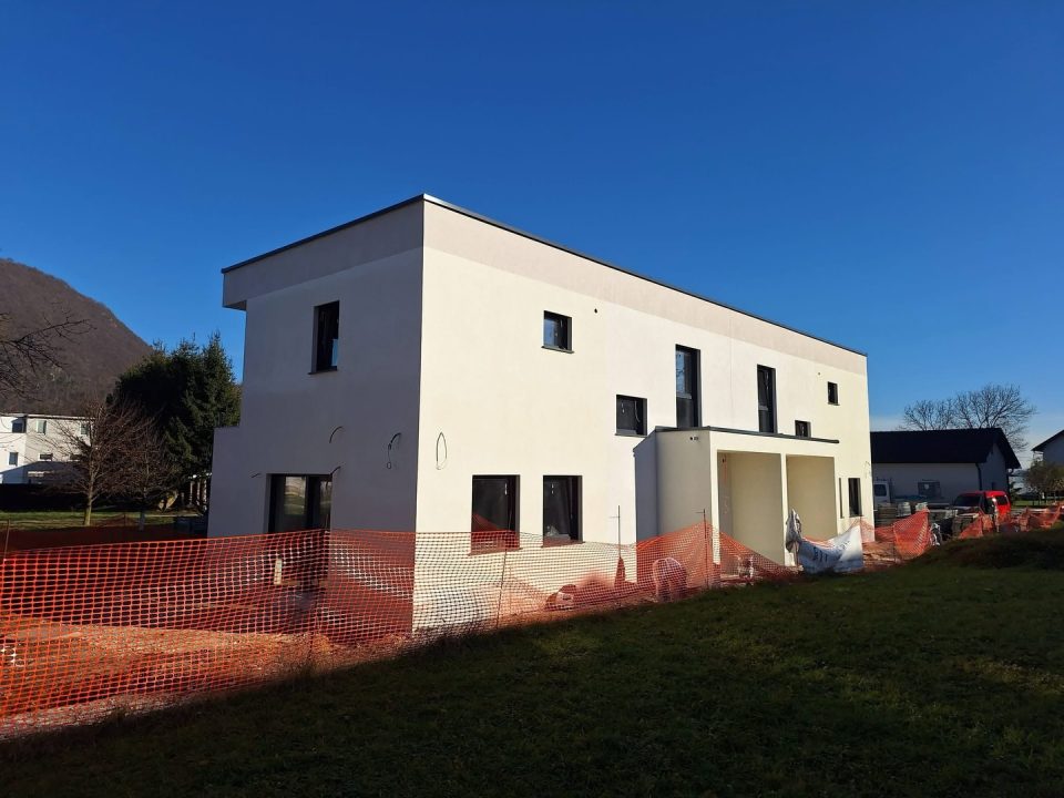 Dvostanovanjska hiša moderne gradnje, ki ponuja prijazno družinsko bivališče.