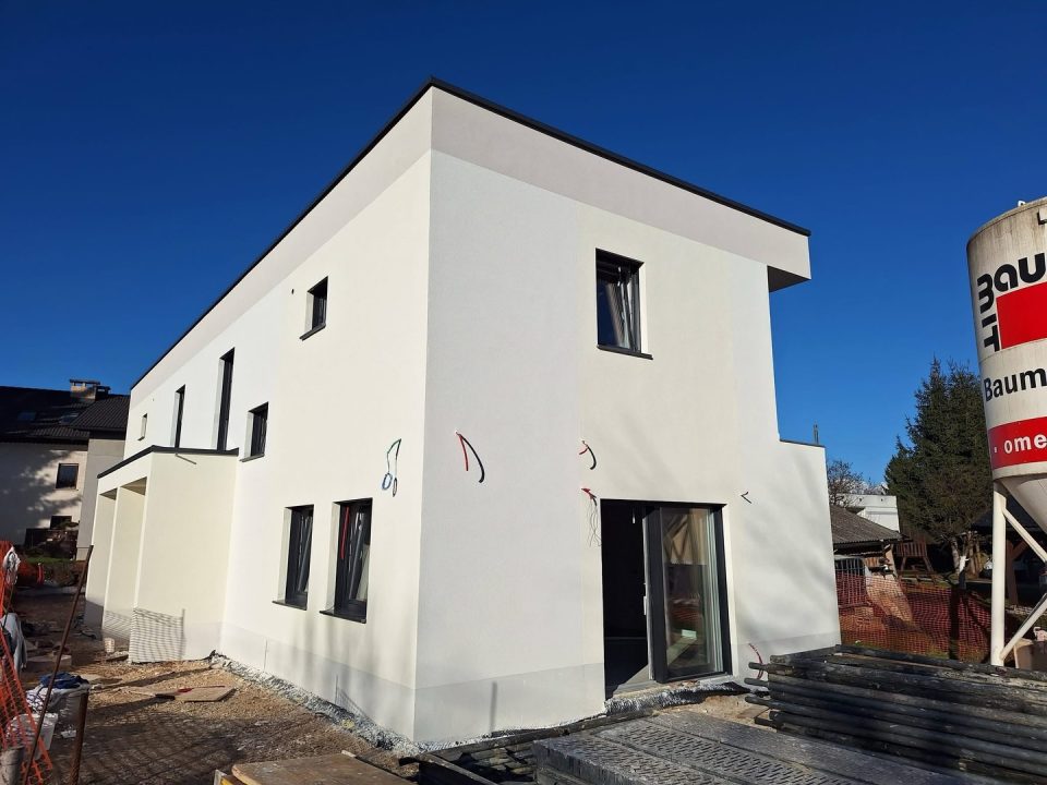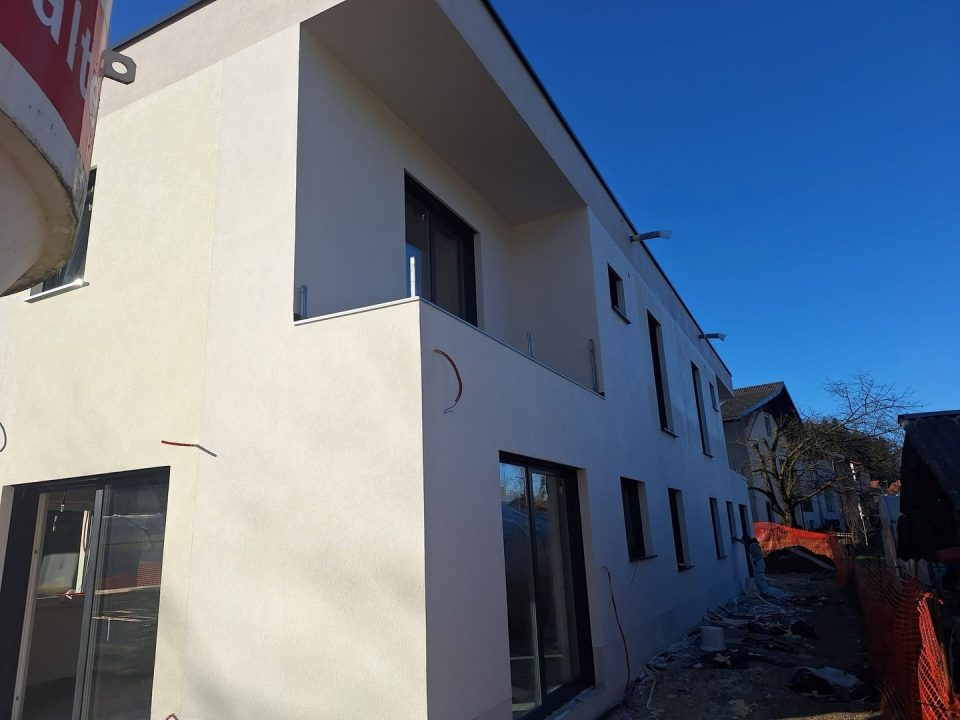 Moderna gradnja stanovanjske hiše v Dolskem pri Ljubljani. Enostavna in prijetna za bivanje, hkrati pa je s svojim izgledom v trendu.